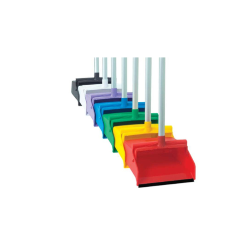 Recogedor de plástico reforzado con sistema dual: puede ser utilizado como recogedor tipo lobby de balancín o como recogedor fijo con bastón. Fabricado en resistente polipropileno de alto impacto y bastón de aluminio (materiales aptos para ser utilizados en áreas de alimentos sin contaminarlos).