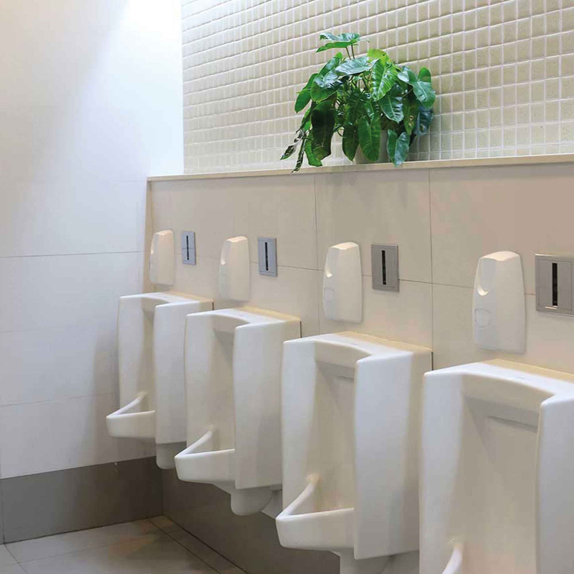 El sistema dosifica nuestra solución por medio de equipos que son colocados en los WC por nuestro personal, proporcionando un mantenimiento programable para inodoros, urinarios y baños. Las recargas son cambiadas por nuestro personal en las visitas de servicio.